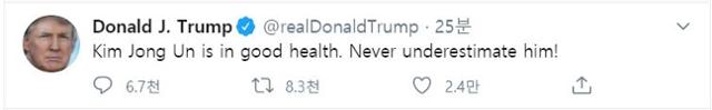 트럼프 대통령은 10일(현지시간) 트위터에 "김정은은 건강하다. 절대 그를 과소평가하지 말라!"라는 짧은 글을 올렸다. 이후 김 위원장과 관련한 언급은 트윗에 등장하지 않았다.