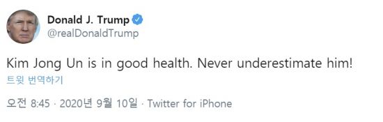 트럼프 대통령은 지난5월 김 위원장이 공개석상에서 자취를 감췄다 20일만에 모습을 드러내자 "그가 돌아온 것, 그리고 건강한 것을 보게 돼서 기쁘다"고 트윗을 올린 바 있다.