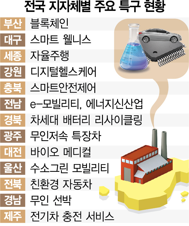 전국적으로 서울·경기 등 수도권을 뺀 전국 지자체에 21개의 특구가 지정돼 있다. 예를 들어 △부산 블록체인 △전남 e-모빌리티 △전북 친환경 자동차 △경남 무인선박 등이 대표적이다. 경북의 경우 ‘차세대 배터리 리사이클링’ 산업을 키우고 있다. 철강 메카인 포항은 글로벌 공급 과잉과 수요 둔화로 어려움을 겪으면서 특구를 통해 제2의 반도체라 불리는 2차 전지 산업의 소재 공급 전진기지로 탈바꿈하고 있다. /이상훈기자