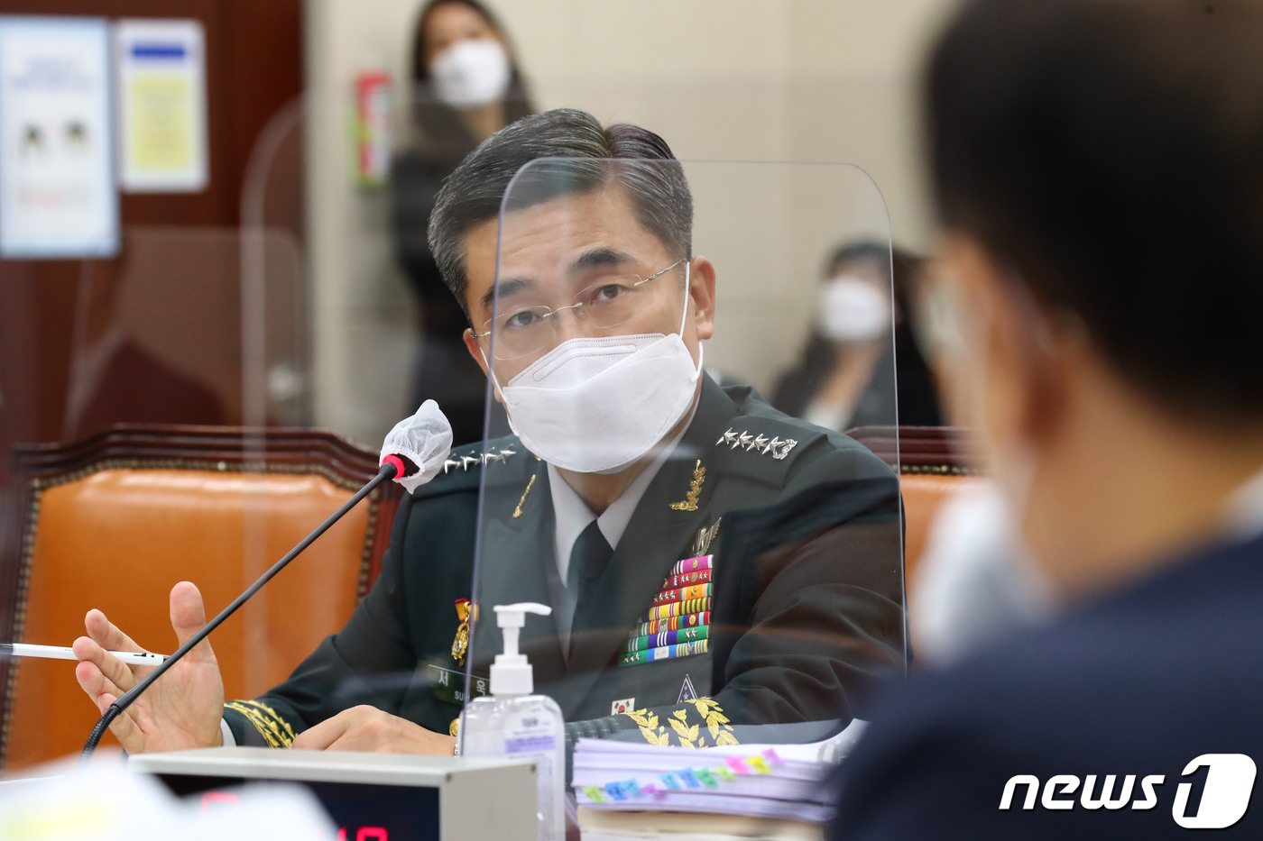 (서울=뉴스1) 성동훈 기자 = 서욱 국방부 장관 후보자가 16일 서울 여의도 국회 국방위원회 전체회의에서 열린 인사청문회에서 의원들의 질문에 답변하고 있다. 2020.9.16/뉴스1