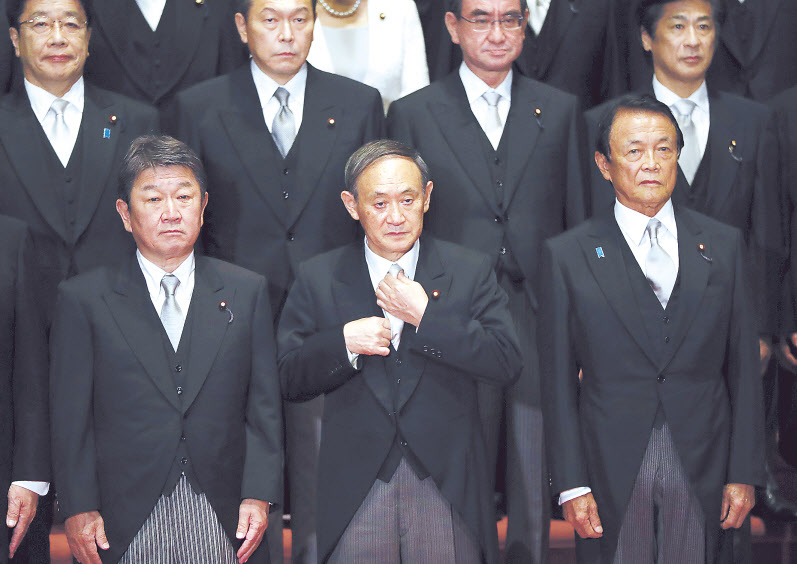 스가 요시히데(가운데) 일본 신임 총리와 새 내각의 각료들이 지난 16일 총리 관저에서 기념사진을 찍고 있다. 스가 총리 오른쪽은 연임에 성공한 아소 다로 부총리 겸 재무상, 왼쪽은 모테기 도시미쓰 외무상. [AP 연합] |