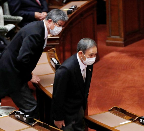 스가 요시히데 일본 신임 총리(오른쪽)가 17일 도쿄 국회의사당에서 열린 임시국회 개회식에 참석해 인사하고 있다. 그는 전날 문재인 대통령이 보낸 축전에도 불구하고 이날까지 한국과 관련된 언급을 하지 않았다. 전임 아베 신조 내각에서 유임된 모테기 도시미쓰 일본 외무상은 17일 스가 내각 첫 내각회의를 마친 뒤 한일관계 냉각의 핵심이 강제징용 문제라며 "국제법을 위반하고 있는 쪽이 한국이라는 것은 틀림없다"고 말했다. 로이터뉴스1 |