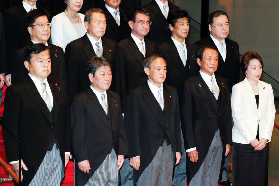 지난 16일 출범한 스가 내각 각료들이 총리 관저에서 기념촬영을 하고 있다. 로이터 뉴스1 |