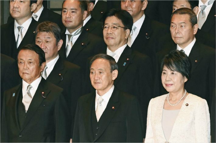 스가 요시히데 일본 총리(앞쪽 가운데)가 16일 오후 도쿄 지요다구 규덴에서 나루히토 일왕으로부터 임명장을 받은 뒤 다른 각료들과 함께 기념사진을 찍고 있다.(사진=연합뉴스) |