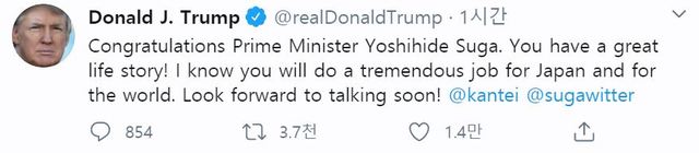트럼프 대통령은 이날 "스가 요시히데 총리 축하한다. 당신은 멋진 인생 이야기를 갖고 있다!"고 트윗했다.