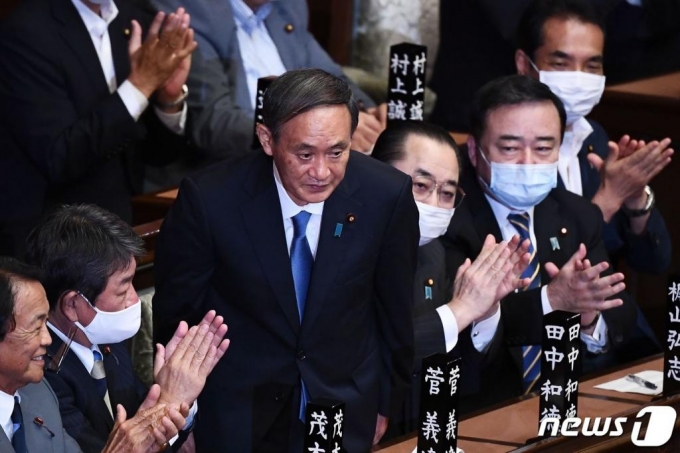 스가 요시히데 일본 신임 총리가 16일 도쿄 중의원 본회의에서 총리로 선출된 뒤 의원들의 박수를 받고 있다/사진= AFP=뉴스1 |
