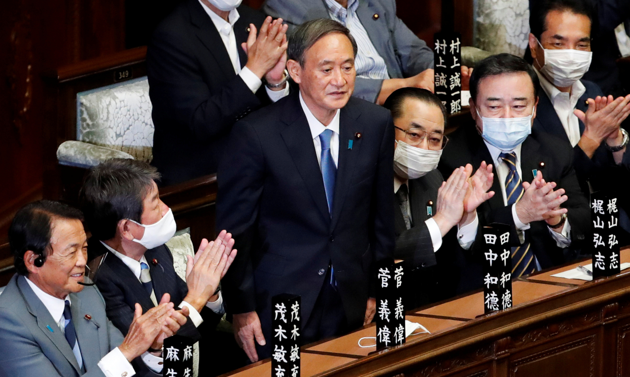 일본의 집권 자민당 스가 요시히데 총재가 16일 도쿄 중의원에서 새 총리로 선출된 직후 의원들의 박수를 받으며 자리에서 일어서 있다. [연합] |