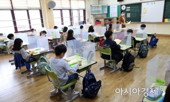 수도권 지역 유치원과 초·중·고교의 등교수업이 재개된 21일 서울 강동구 한산초등학교 2학년 학생들이 1교시 수업을 하고 있다./강진형 기자aymsdream@ |