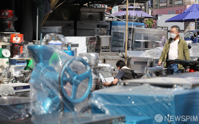 [서울=뉴스핌] 김학선 기자 = 코로나19 사태 장기화로 식당 등 자영업자들의 폐업률이 증가하는 가운데 21일 오후 서울 중구 황학동 주방거리에 중고 주방기구들이 쌓여 있다. 2020.09.21 yooksa@newspim.com