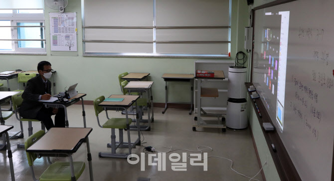 [이데일리 방인권 기자]전국 중·고등학교 3학년부터 온라인 개학이 시작된 지난 4월 9일 오전 서울 성동구 도선고등학교 교실에서 담임 선생님이 온라인으로 수업을 진행하고 있다. |