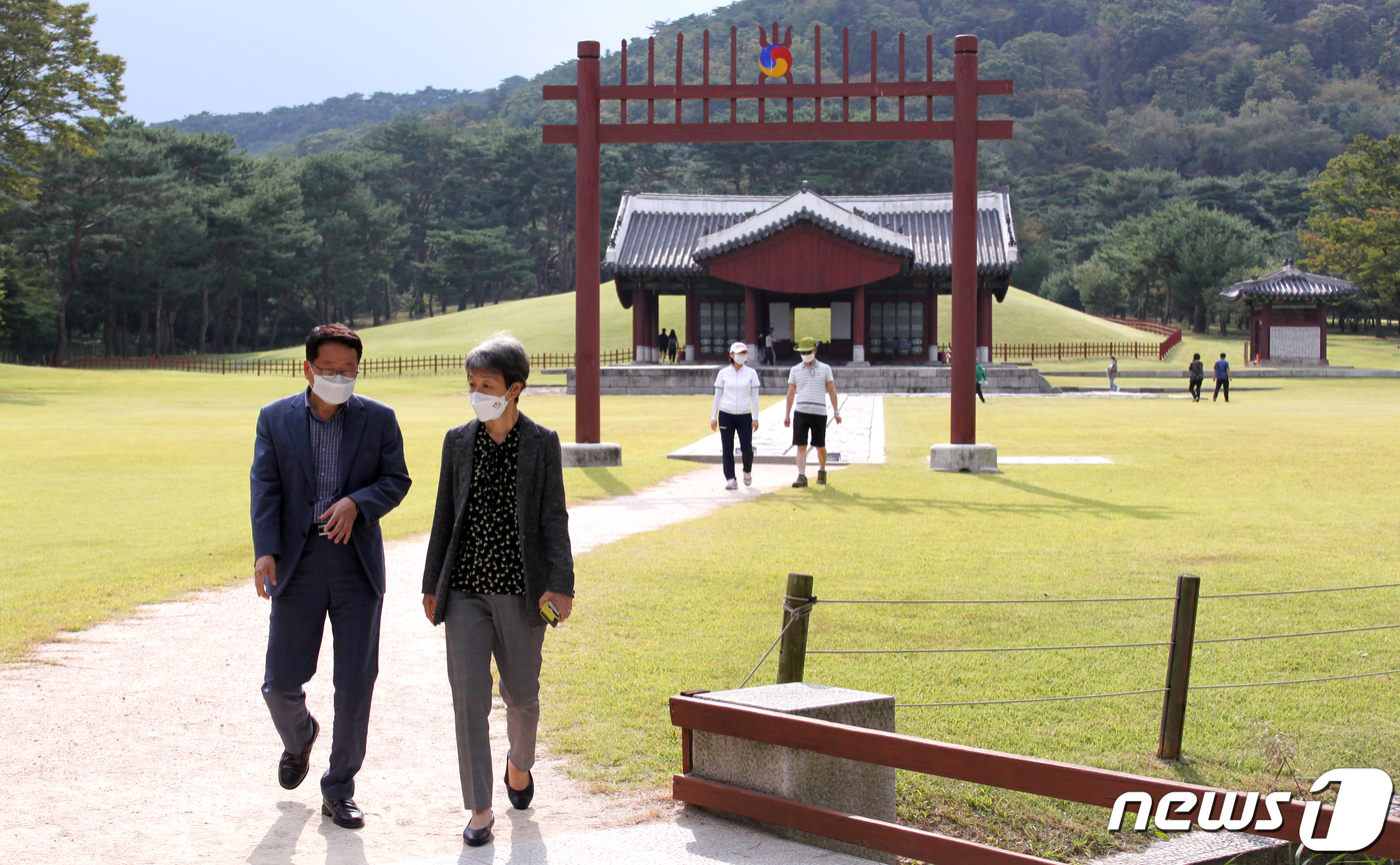 (서울=뉴스1) 구윤성 기자 = 추석 연휴인 30일 오후 정재숙 문화재청장(오른쪽)과 나명하 궁능유적본부장이 서울 성북구 의릉을 찾아 현장점검을 하고 있다. 유네스코 세계유산인 조선왕릉 의릉은 조선 제20대 임금 경종과 선의왕후의 능으로, 사적 제204호로 지정돼 있다. (문화재청 제공) 2020.10.1/뉴스1