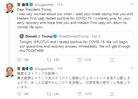 스가 총리는 영어와 일본어 두 가지 버전으로 "코로나에 감염됐다는 트윗을 보고 걱정했는데, 두 분(트럼프 대통령 부부)이 조속히 코로나19를 극복하고 일상을 되찾기를 기원한다"고 밝혔다.