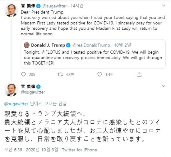 3일 스가 총리는 본인의 트위터를 통해 "(트럼프 대통령 부부가) 코로나19에 감염됐다는 트윗을 보고 걱정했다"며 "두 분이 어서 코로나19를 극복하고 일상의 삶을 되찾기를 기원한다"고 밝혔다. 스가 총리는 같은 내용의 글을 영어와 일본어로 함께 올렸다.