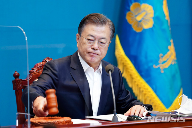[서울=뉴시스]추상철 기자 =문재인 대통령이 6일 오전 청와대 여민관에서 영상으로 열린 제51회 국무회의에 참석해 의사봉을 두드리고 있다. 2020.10.06. scchoo@newsis.com |
