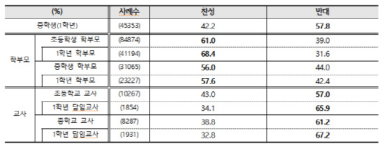 해당 설문조사는 지난달 23일부터 26일까지 서울 거주 초·중학교 학부모와 교사, 중학교 1학년 학생을 대상으로 온라인에서 진행됐다.
