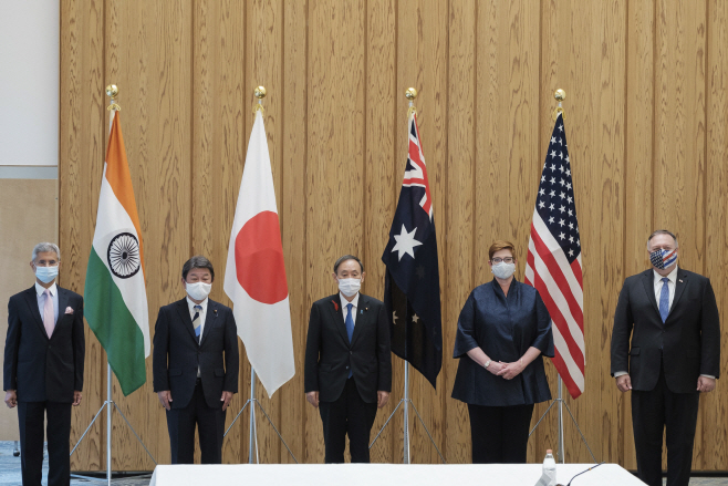S. 자이샨카르 인도 외교부 장관(왼쪽부터)·모테기 도시미쓰(茂木敏充) 일본 외무성 대신·스가 요시히데(菅義偉) 일본 총리·마리스 페인 호주 외무부 장관·마이크 폼페이오 미국 국무부 장관이 6일(현지시간) 일본 도쿄(東京) 총리관저에서 기념사진을 찍고 있다./사진=도쿄 AP=연합뉴스 |