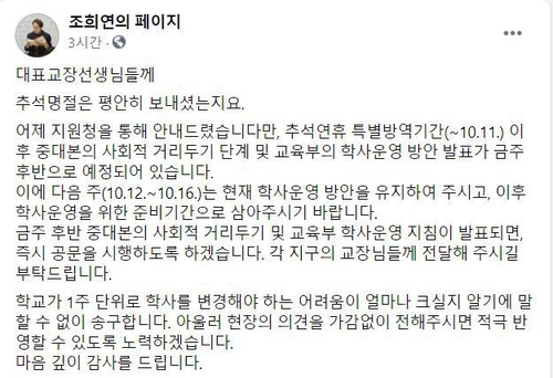 조희연 서울시교육감은 7일 페이스북에 올린 글에서 "대표 교장 선생님들께, 다음 주(10월 12일∼10월 16일)는 현재 학사운영 방안을 유지해 주시고, 이후 학사 운영을 위한 준비 기간으로 삼아주시기 바랍니다"라고 밝혔다.