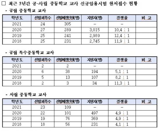 선발인원은 공립의 경우 중등교사 24과목 305명과 특수중등교사 2과목 2명 등 307명이고, 사립은 35개 법인 23과목 109명이다.