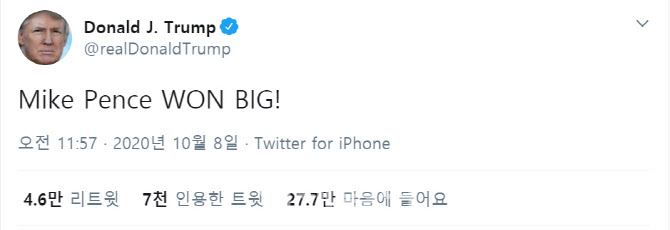 [이데일리 방성훈 기자] 도널드 트럼프 미국 대통령이 7일(현지시간) 자신의 러닝메이트인 마이크 펜스 부통령과 민주당 부통령 후보로 나선 카멀라 해리스 상원의원 간 벌인 TV토론회에 대해 “마이크 펜스가 크게 이겼다”고 주장했다.