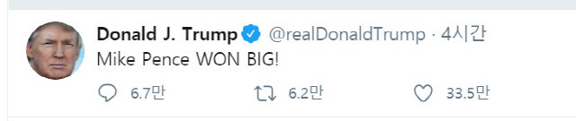 7일(현지시간) 진행된 미국 대선 부통령 후보 간의 TV토론을 두고 도널드 트럼프 미국 대통령은 마이크 펜스 부통령이 크게 이겼다고 자평했다. 그는 이날 트위터에 “마이크 펜스가 크게 이겼다!”고 적었다.