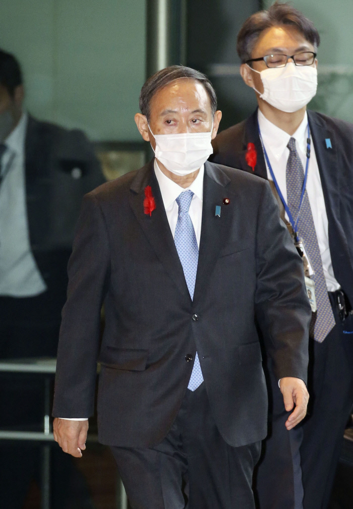 스가 요시히데 일본 총리가 5일 오후 출입 기자단과 공동인터뷰를 마친 뒤 마스크를 쓴 채 관저를 나서고 있다. 도쿄|연합뉴스 |