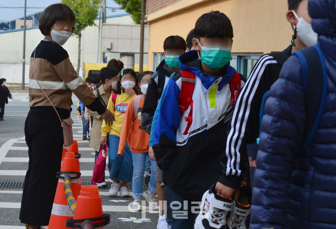 사회적 거리두기가 1단계로 완화된 12일 오전 광주 광산구 소촌동 모 초등학교에서 초등생들이 일렬로 등교하고 있다.(사진=뉴시스) |
