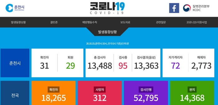 강원 춘천시 인터넷 홈페이지 코로나19 발생 현황 캡처 화면. |