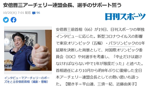 아베 전 총리는 이번 닛칸스포츠 인터뷰에서 "일본은 남녀 모두 (양궁 종목에) 유망한 선수가 있다"면서 신종 코로나바이러스 감염증(코로나19) 때문에 내년 7월로 연기된 2020도쿄올림픽 양궁 종목에 큰 기대감을 나타냈다.