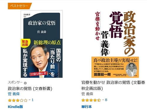 (도쿄=연합뉴스) 20일 출간된 스가 요시히데 일본 총리의 저서 '정치가의 각오' 개정판(왼쪽). 오른쪽은 기존 단행본. [판매사이트 아마존재팬 캡처. 재판매 및 DB 금지] |