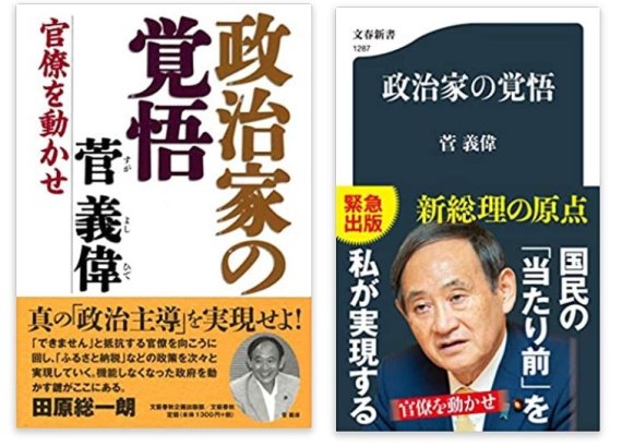 스가 요시히데 총리가 지난 2012년 펴낸 정치가의 각오(좌)와 2020년 개정판(우). 아마존 재팬 캡쳐 |