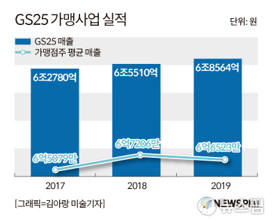 지난해 GS25 가맹점당 평균 매출은 전년 대비 683만원 줄어든 6억6523만원을 기록했다. 2018년(6억7206만원) 가맹점당 평균 매출이 전년보다 무려 2127만원 늘어난 것과 비교하면 1년 사이 점주 이익이 급격히 감소한 것이다.