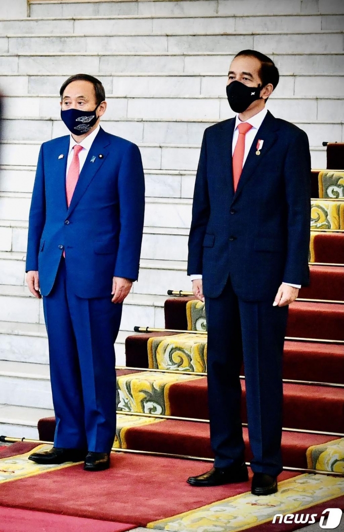 스가 요시히데 일본 총리가 20일(현지시간) 자카르타 외곽에 있는 보고르 대통령궁에서 열린 환영식에 조코 위도도 인도네시아 대통령과 참석을 하고 있다./사진=(보고르 AFP=뉴스1) |