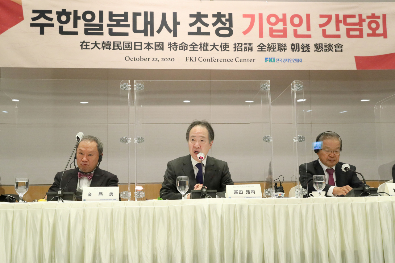 도미타 코지 주한일본대사(가운데)가 22일 전경련회관 컨퍼런스센터에서 열린 '주한일본대사 초청 기업인 간담회'에서 기조연설을 하고 있다. 오른쪽은 권태신 전경련 부회장. [전국경제인연합회 제공] |