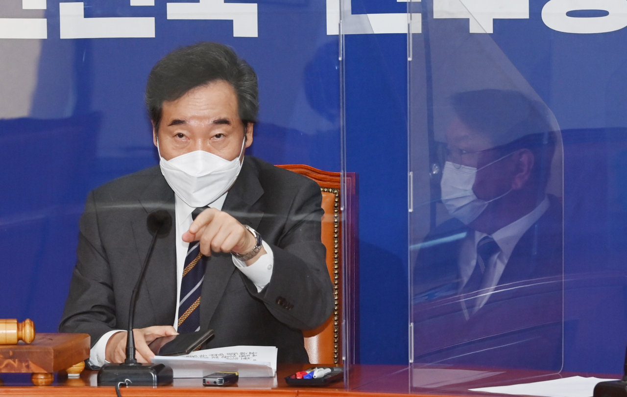 더불어민주당 이낙연 대표가 23일 오전 국회에서 열린 최고위원회의에서 한 참석자에게 손으로 신호를 보내고 있다. 연합뉴스 |