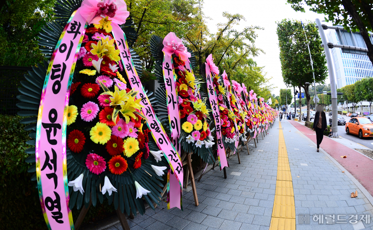 19일 한 시민이 윤 총장을 응원하는 뜻에게 대검 앞에 화환을 보내면 시작된 화환 행렬은 22일 대검 국정감사를 전후해 더 늘었다.