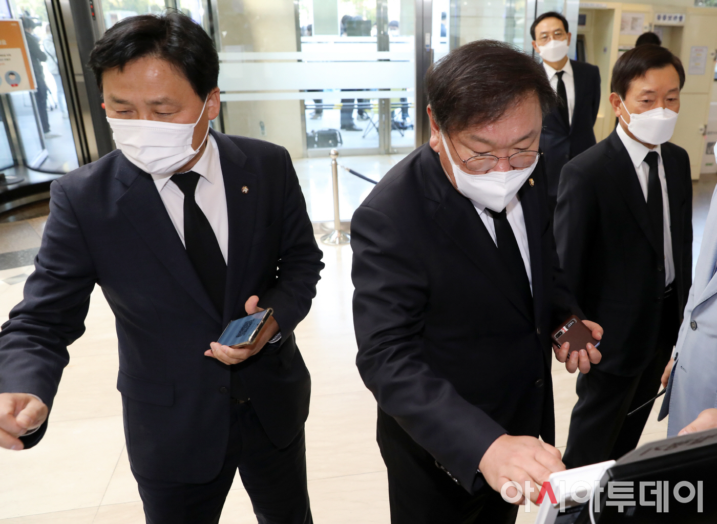 아시아투데이 정재훈 기자 = 김태년 더불어민주당 원내대표(오른쪽)와 김영진 원내수석부대표가 26일 오전 서울 강남구 삼성서울병원에 마련된 고(故) 이건희 삼성그룹 회장의 빈소로 들어서며 전자출입명부(QR코드)기기를 이용해 출입증을 발급받고 있다. /사진공동취재단