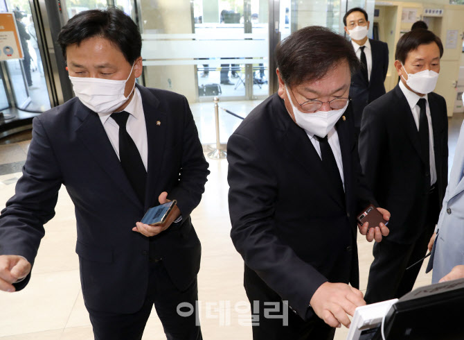 [사진공동취재단] 김태년 더불어민주당 원내대표(오른쪽)와 김영진 원내수석부대표가 26일 오전 서울 강남구 삼성서울병원에 마련된 고 이건희 삼성그룹 회장의 빈소로 들어가고 있다.