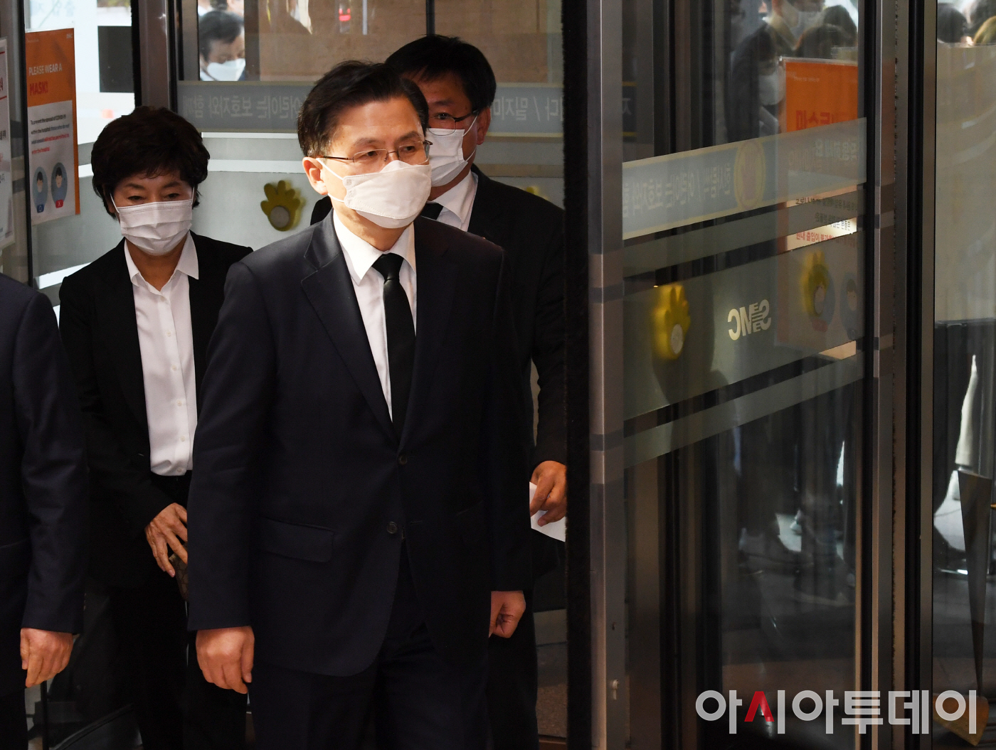 아시아투데이 정재훈 기자 = 황교안 전 미래통합당 대표(가운데)가 26일 오후 고 이건희 삼성그룹 회장 빈소가 마련된 서울 강남구 삼성서울병원 장례식장에 들어서고 있다. /사진공동취재단