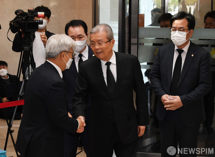 [서울=뉴스핌] 사진공동취재단 = 김종인 국민의힘 비상대책위원장(오른쪽)이 26일 오후 고(故) 이건희 삼성그룹 회장 빈소가 마련된 서울 강남구 삼성서울병원 장례식장에 들어서고 있다. 2020.10.26 photo@newspim.com