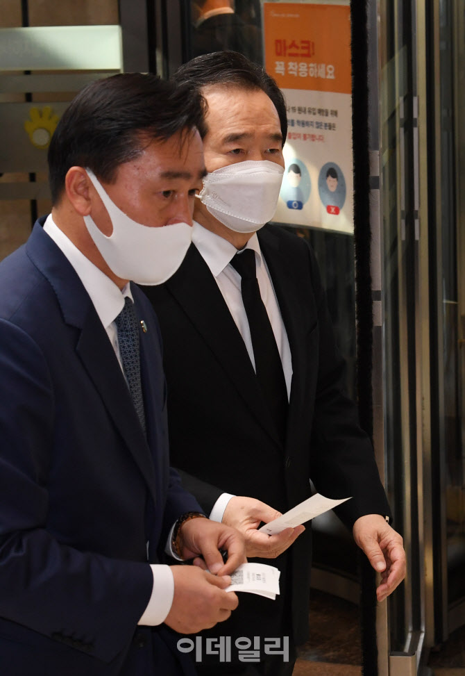 [사진공동취재단] 정세균 국무총리(오른쪽)가 26일 오후 고 이건희 삼성그룹 회장 빈소가 마련된 서울 강남구 삼성서울병원 장례식장에 들어서고 있다.