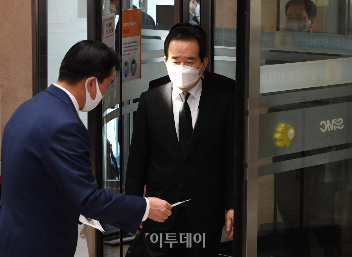 정세균 국무총리(오른쪽)가 26일 오후 고 이건희 삼성그룹 회장 빈소가 마련된 서울 강남구 삼성서울병원 장례식장에 들어서고 있다. 사진공동취재단