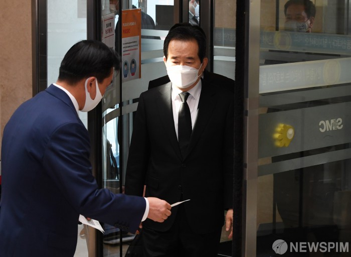[서울=뉴스핌] 사진공동취재단 = 정세균 국무총리가 26일 오후 고(故) 이건희 삼성그룹 회장 빈소가 마련된 서울 강남구 삼성서울병원 장례식장에 들어서고 있다. 2020.10.26 photo@newspim.com