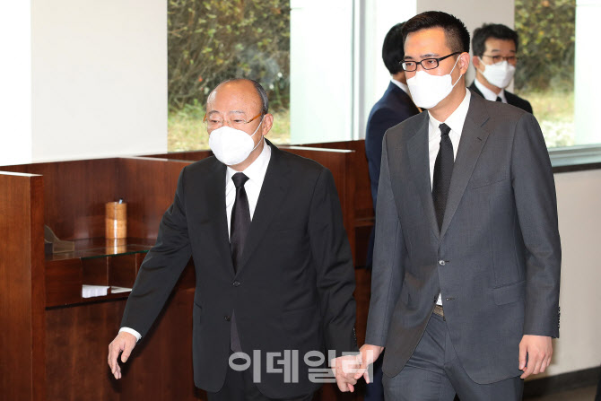 [사진공동취재단] 김승연 한화그룹 회장이 26일 오후 서울 강남구 서울삼성병원 장례식장에 마련된 고 이건희 삼성그룹 회장 빈소에 아들인 김동선 전 한화건설 팀장과 함께 조문을 마친 후 나서고 있다.