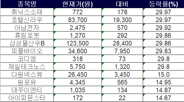 이밖에도 휘닉스소재(29.97%), 휴림로봇(29.86%), 피플바이오(29.83%), 코디엠(29.8%), 제일테크노스(29.8%), 다원넥스뷰(15.0%), 원포유(14.95%), 대주이엔티(14.87%), 아이피몬스터(14.67%) 등이 상한가를 기록했다.
