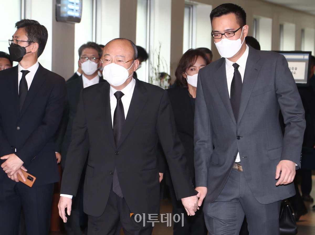 김승연 한화그룹 회장과 김동선 전 한화건설 팀장이 26일 오후 고(故) 이건희 삼성 회장의 빈소가 마련된 서울삼성병원 장례식장에서 조문을 마친 뒤 나서고 있다. 사진공동취재단
