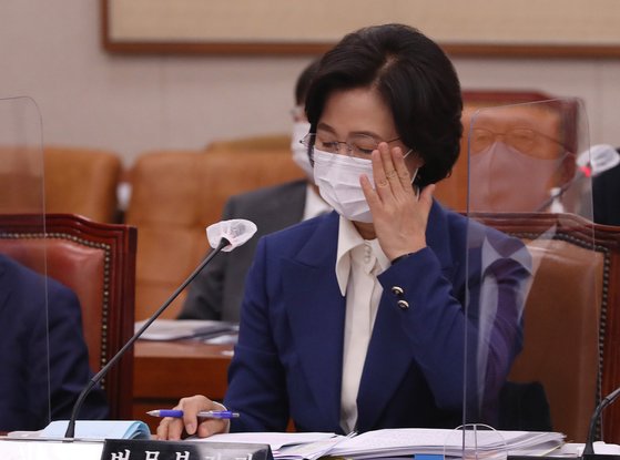 추미애 법무부 장관이 지난 26일 서울 여의도 국회에서 열린 법제사법위원회의 법무부, 대법원, 감사원 등에 대한 종합국정감사에 출석해 의원 질의를 경청하며 안경을 고쳐쓰고 있다. 오종택 기자 |