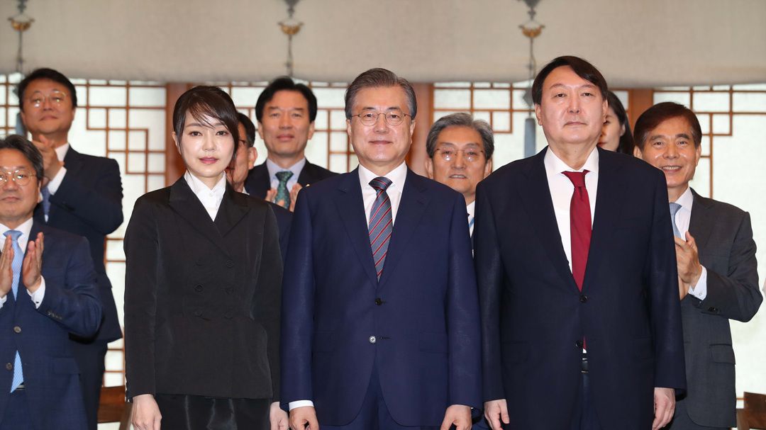 문재인 대통령이 작년 7월 25일 청와대 본관에서 윤석열 검찰총장 임명장 수여식을 마치고 함께 기념촬영을 하고 있다. /뉴시스 |