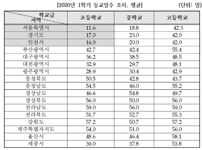서울 초등생 평균 11.6일·경기 17일