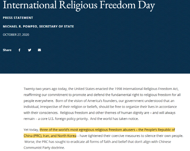 마이크 폼페이오 미국 국무부 장관은 27일(현지시간) 국제 종교자유의 날 기념 성명에서 세계에서 가장 지독한(egregious) 종교의 자유 박해 국가로 중국과 이란·북한을 꼽았다./사진=미 국무부 홈페이지 캡처 |