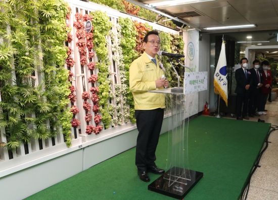 구는 도심 속 자연환경조성을 위해 지난 6월 미세먼지프리존 개선사업에 착공, 27일 완공기념식을 통해 스마트팜과 벽천폭포, 미디어월, ‘미미위 강남’ 포토존 등 볼거리 가득한 주민 맞춤형 쉼터를 선보였다.